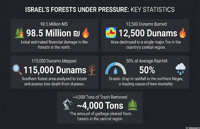 The war in the north, the climate crisis in the south, and intense human activity in the center of the country combined to make 2025 one of the most challenging years Israel’s forests have faced. Data from KKL–JNF point to significant damage, but also to a conceptual shift and the beginning of a recovery process.